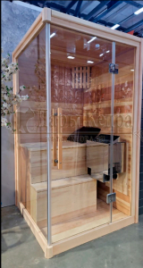Это специально оборудованная готовая деревянная кабина для сухого и влажного парения. Электропечь нагревает пространство внутри и позволяет сбрызгивать камни водой, слегка увлажняя воздух. Такая процедура позволяет избежать перегрева. Каркас сауны выполнен из массива кедра, снаружи и внутри обшит липовой вагонкой сорта «Экстра» и имеет теплоизоляционный слой. Также двухуровневый полок идёт из кедра для обогащения внутри кабины полезными фитонцидами, а в сочетании с противовирусными свойствами липы сауна становится настоящим источником здоровья.