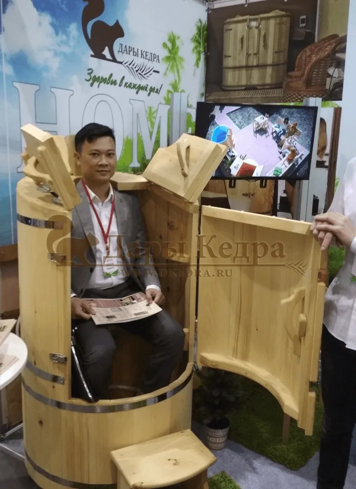 Овальная фитобочка из кедра - это мини парная, которую можно использовать не только в спа-салонах, но и дома. Овальная модель более просторна и удобна в использовании. Толщина стенок составляет 25 мм. Она оборудована откидными створками, дверцей и отверстием для головы. Во время парения человек сидит внутри кедровой бочки, а голова находится снаружи. Благодаря этому исключается возможность перегрева. Подлокотники из кедра, встроенные ручки на створках и двери делают эксплуатацию более удобной.