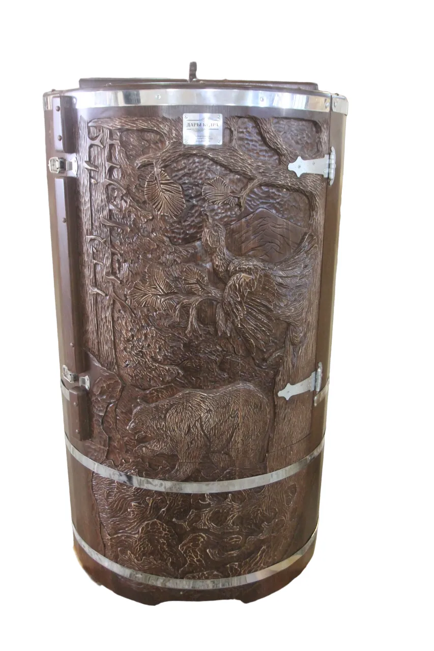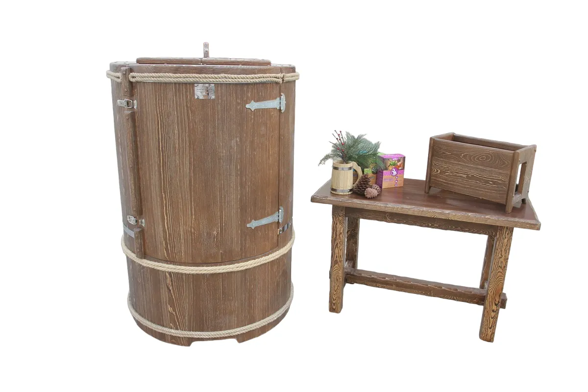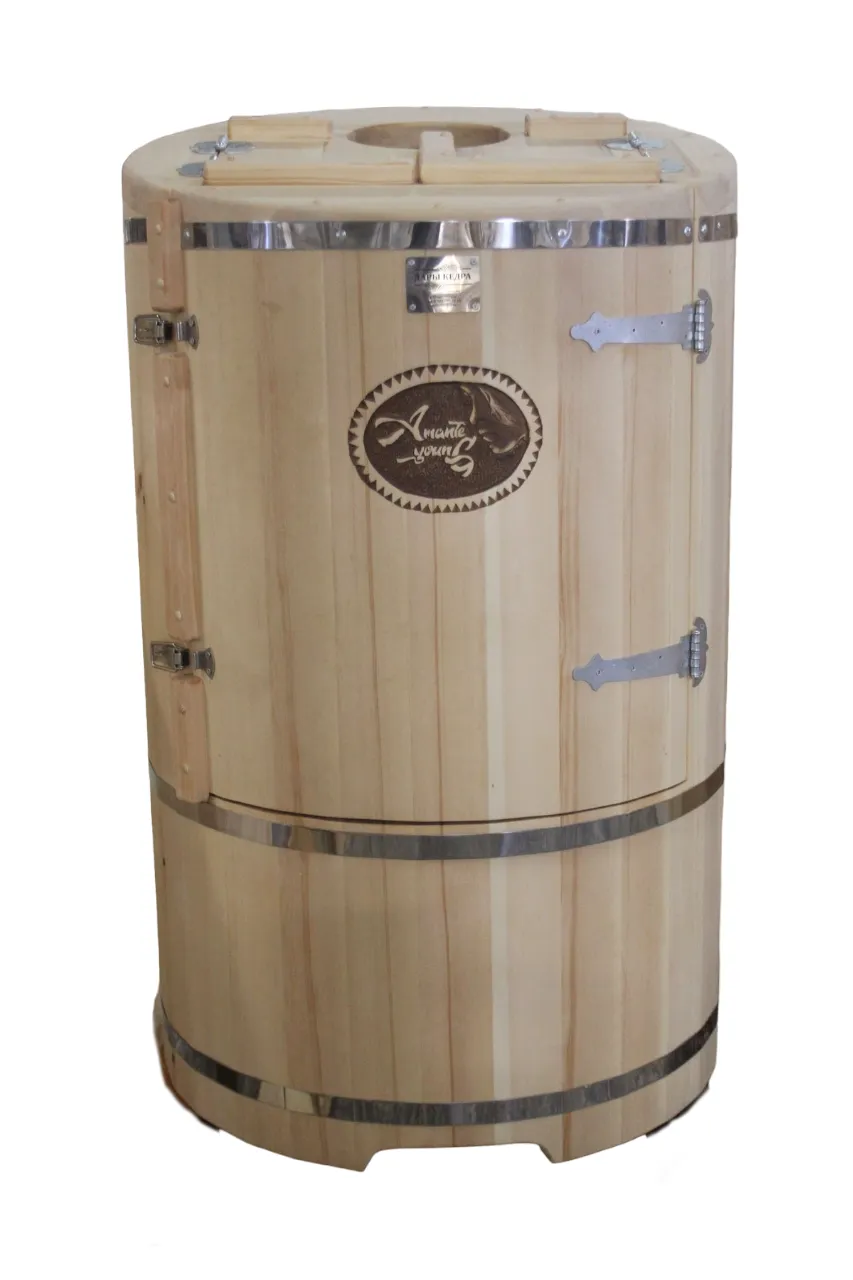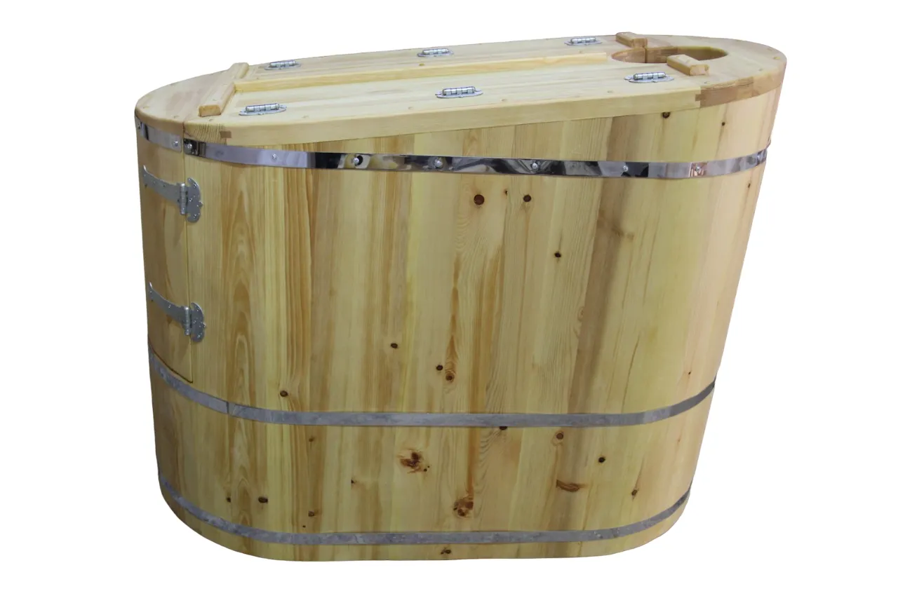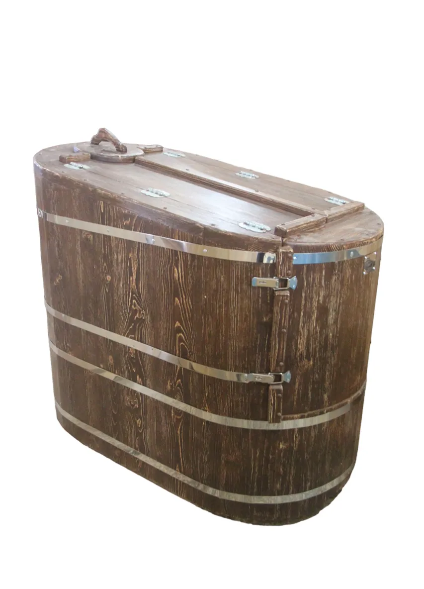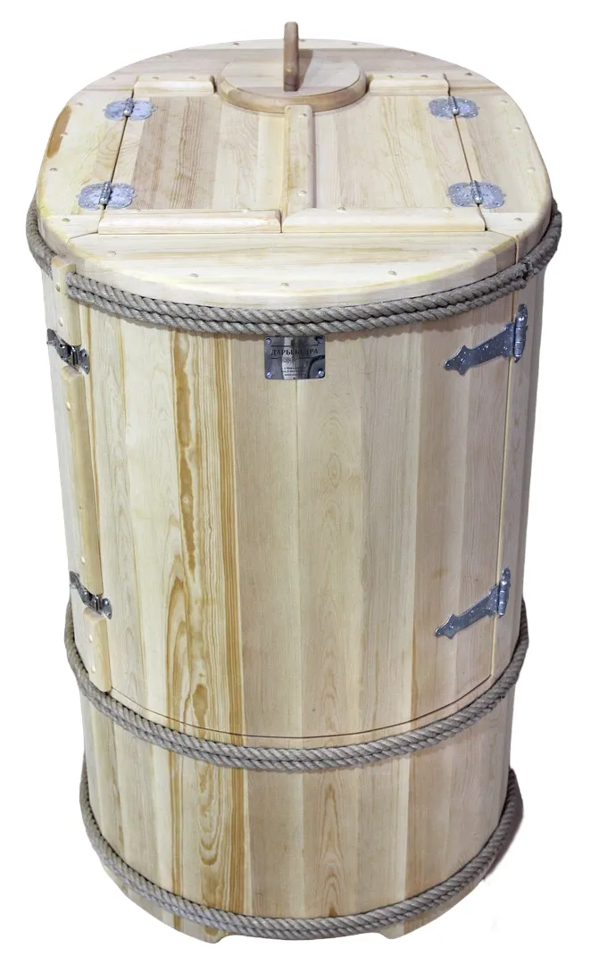 Овальная фитобочка из кедра - это мини парная, которую можно использовать не только в спа-салонах, но и дома. Овальная модель более просторна и удобна в использовании. Толщина стенок составляет 25 мм. Она оборудована откидными створками, дверцей и отверстием для головы. Во время парения человек сидит внутри кедровой бочки, а голова находится снаружи. Благодаря этому исключается возможность перегрева. Подлокотники из кедра, встроенные ручки на створках и двери делают эксплуатацию более удобной.
