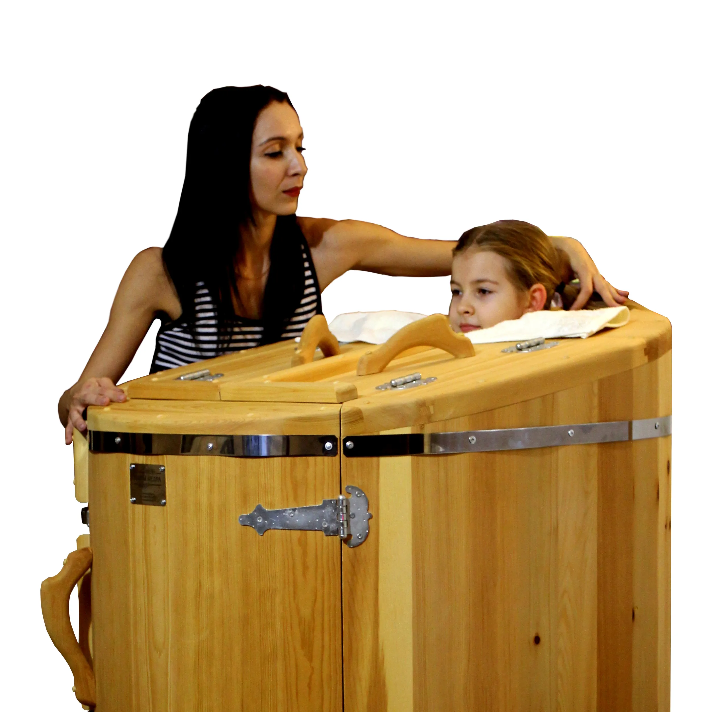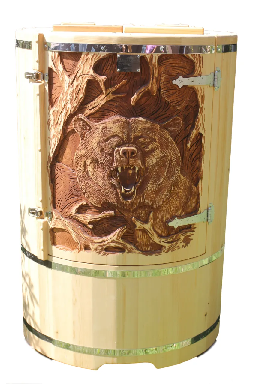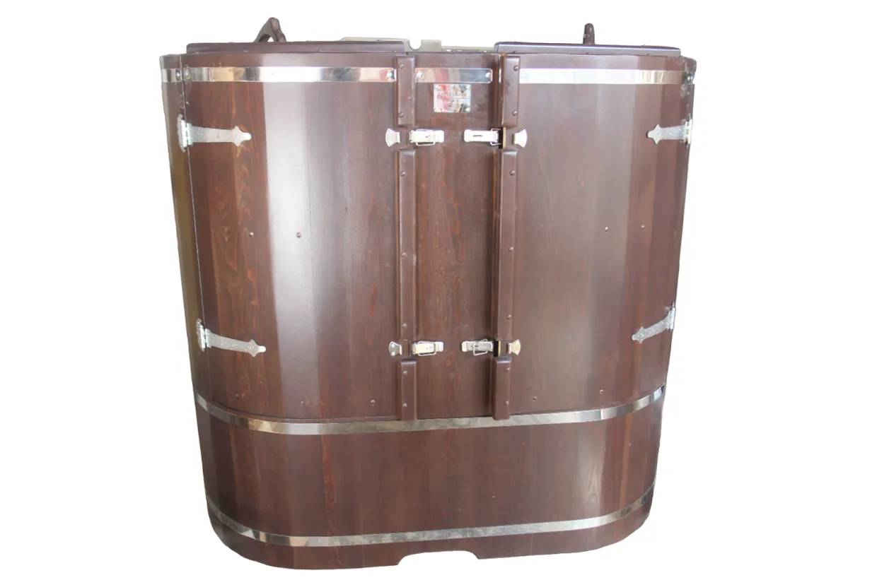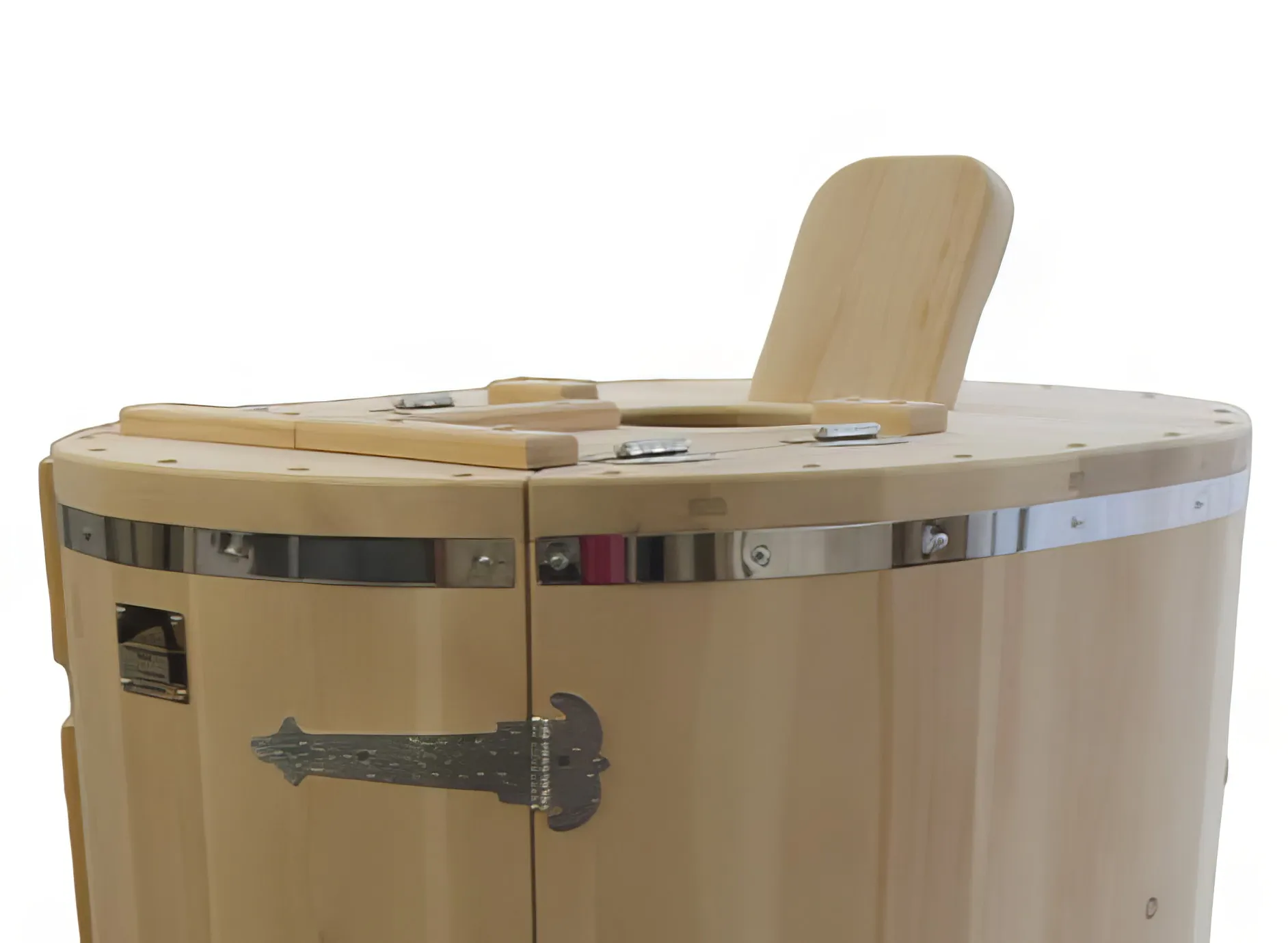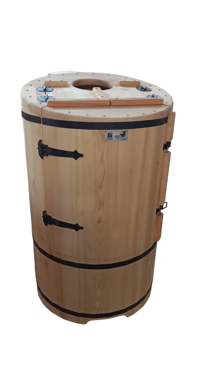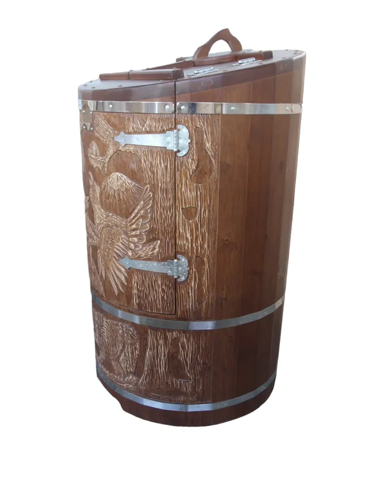 Овальная фитобочка из кедра - это мини парная, которую можно использовать не только в спа-салонах, но и дома. Овальная модель более просторна и удобна в использовании. Толщина стенок составляет 25 мм. Она оборудована откидными створками, дверцей и отверстием для головы. Во время парения человек сидит внутри кедровой бочки, а голова находится снаружи. Благодаря этому исключается возможность перегрева. Подлокотники из кедра, встроенные ручки на створках и двери делают эксплуатацию более удобной.