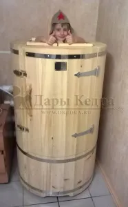 Готовый комплект - это полностью укомплектованный набор с фитобочкой для процедур парения. Круглая модель наиболее компактна и мобильна. Толщина стенок составляет 25 мм. Фитобочка оборудована откидными створками, дверцей и отверстием для головы. Во время парения человек сидит внутри кедровой бочки, а голова находится снаружи. Благодаря этому исключается возможность перегрева. Подлокотники из кедра, встроенные ручки на створках и двери делают эксплуатацию более удобной.