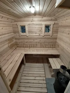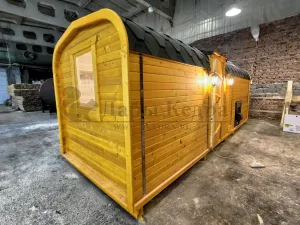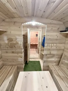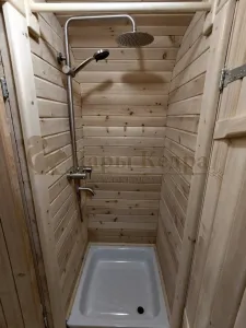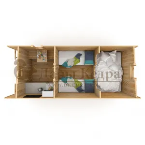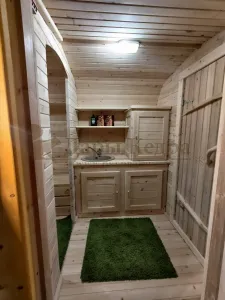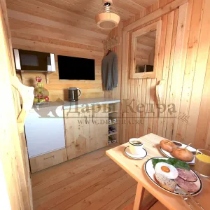 Домик с тремя помещениями подходит для дачного использования в теплое время года или обустройства загородных баз отдыха. Прихожая и кухня занимают одну комнату, в которой стоит стол из кедра. Две другие оборудованы четырьмя деревянными лежаками, по желанию их можно заменить на двуспальные кровати. Либо обустроить санузлом и душевой зоной. Для удобства пользования кемпинг дом можно укомплектовать верандой с лавочками или козырьком.