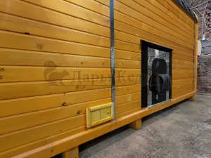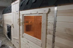 Окна из закаленного стекла (панорамное), можно разместить, как в парилке, так и в комнате отдыха. Может быть установлено только на торцевых (ровных) стенах бани. За дополнительную плату возможно сделать стекло бронзированным.