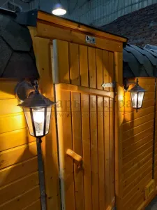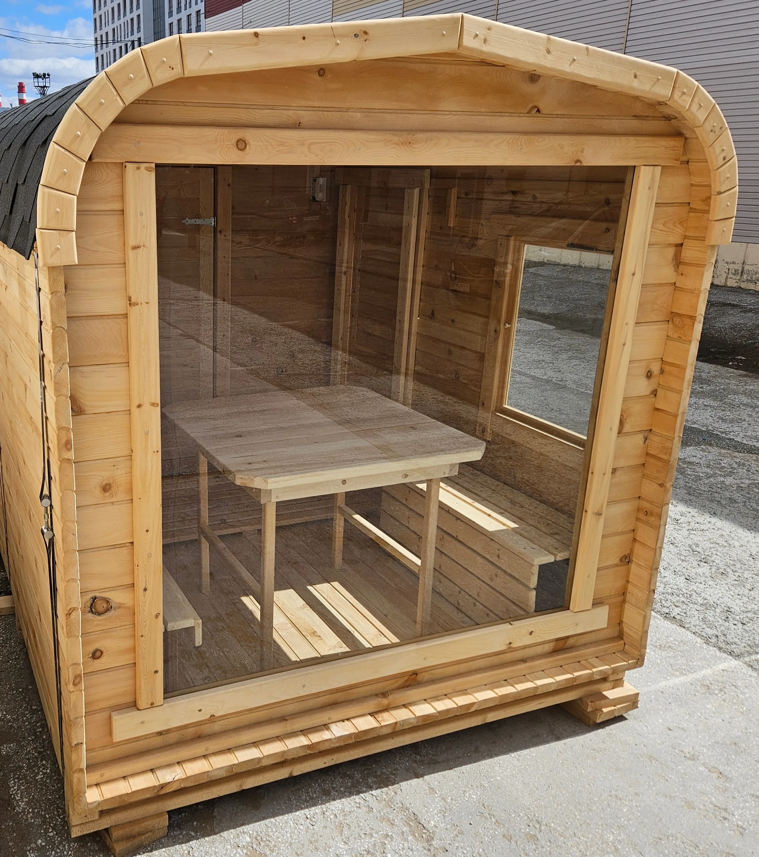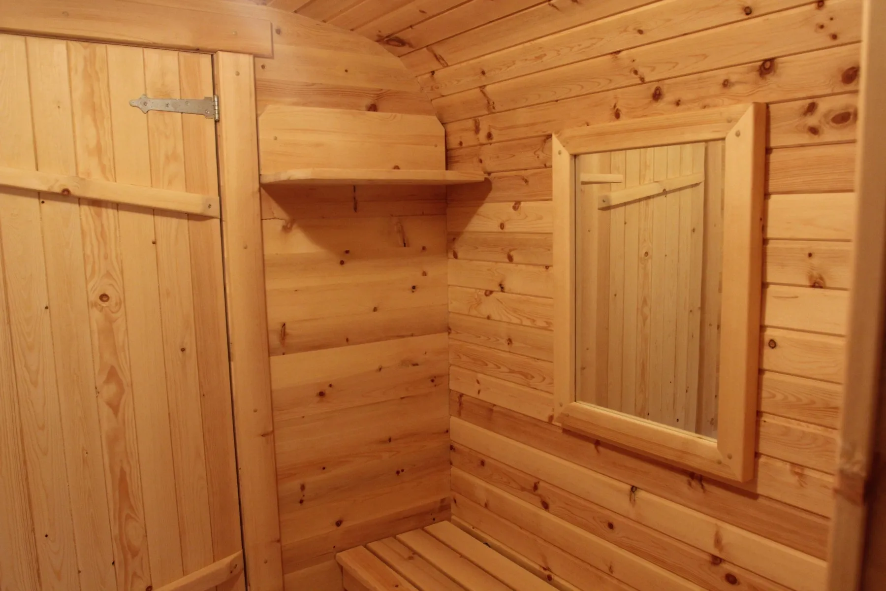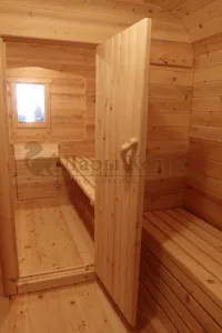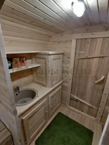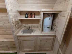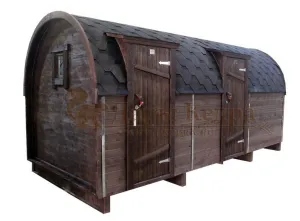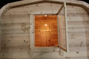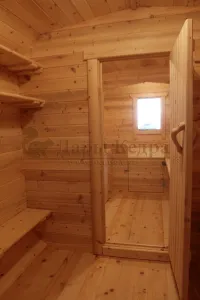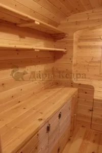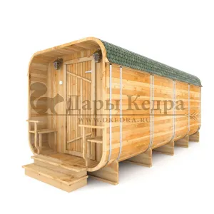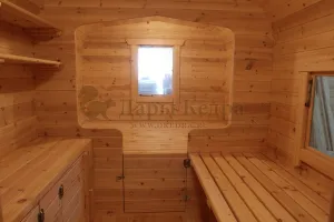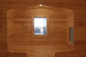 Домик подходит для дачного использования в теплое время года или обустройства загородных баз отдыха. Его можно разграничить на две зоны и использовать как кухню и спальное помещение. Домик оборудован увеличенным окном, четырьмя лежаками из кедра, вешалкой и полкой из кедра. Для удобства пользования кемпинг дом можно укомплектовать верандой с лавочками или козырьком.