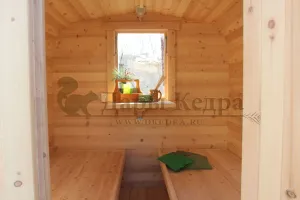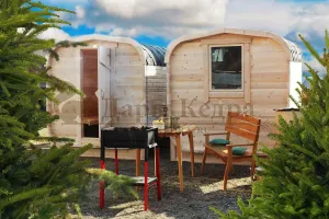 Компактный однокомнатный домик подойдет для дачного использования в теплое время года или обустройства загородных баз отдыха. Домик оборудован двумя лежаками из кедра, между которыми пользования можно поставить откидной столик. Для удобства пользования кемпинг дом можно укомплектовать верандой с лавочками или козырьком.