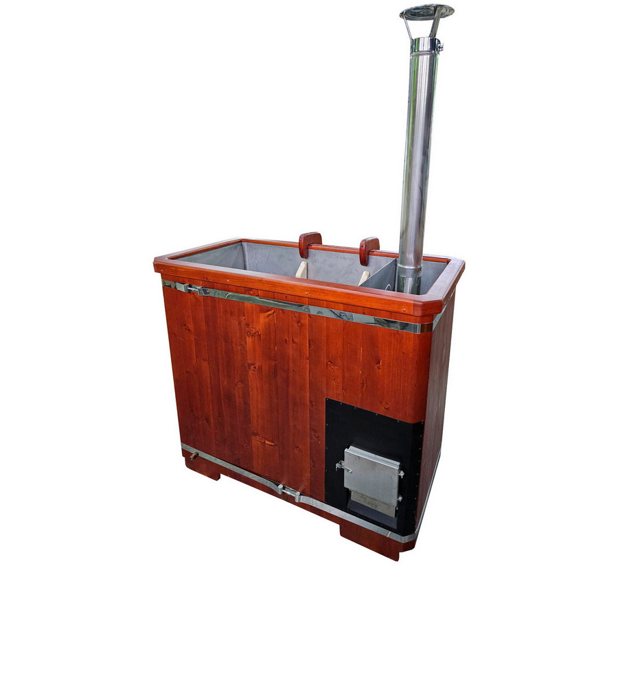 Фурако прямоугольная с металлической вставкой и встроенной печью Фурако со встроенной металлической чашей, печью и внешней отделкой из массива кедра - это уличная баня, которой можно пользоваться круглый год. Купель представляет собой прямоугольную емкость для воды, внутри которой располагается сиденье и трап для ног из кедра. Нагрев воды происходит за счет встроенной печи, которая находится внутри купели за перегородкой. Рекомендуем приобрести термокрышку и весло для перемешивания воды для ускорения нагрева. Для удобства пользования японская баня фурако с металлической вставкой оборудована внешней и внутренней лестницей из кедра.