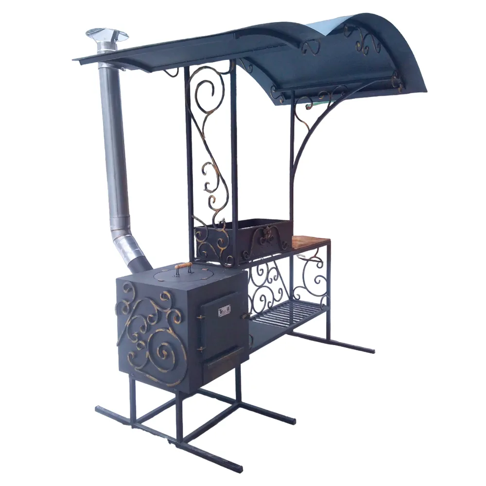 Мангал кованый Уличные мангалы отличаются современным дизайном, функциональностью и комфортной эксплуатацией. Очень прочные, разборные, поэтому могут быть перевезены с одного места на другое без каких-либо сложностей. Наши дизайнеры и технологи предусмотрели всё, чтобы приготовление пищи на природе было безопасным и быстрым. Конструкция станет украшением любого участка. Кованые элементы расскажут об утонченном вкусе владельца. Мангал состоит из классической жаровни и печи под казан, поэтому разнообразие приготовленных блюд покорит любого. Все элементы изделия покрыты специальной жаропрочной краской, защищающей от коррозии и прогорания. Изделие также имеет столик, где можно разместить необходимые приборы для жарки, а под столиком находится полка для дров. Таким образом, мы предусмотрели всё, чтобы приготовление еды на природе было комфортным, безопасным, быстрым процессом, когда всё под рукой.