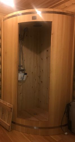 Купили такую душевую кабину, т.к. живем в частном доме и это просто незаменимая вещь, чтобы баню не топить каждый день. Выполнена очень аккуратно, обалденный запах кедра. Кайф! Спасибо, очень довольны покупкой!